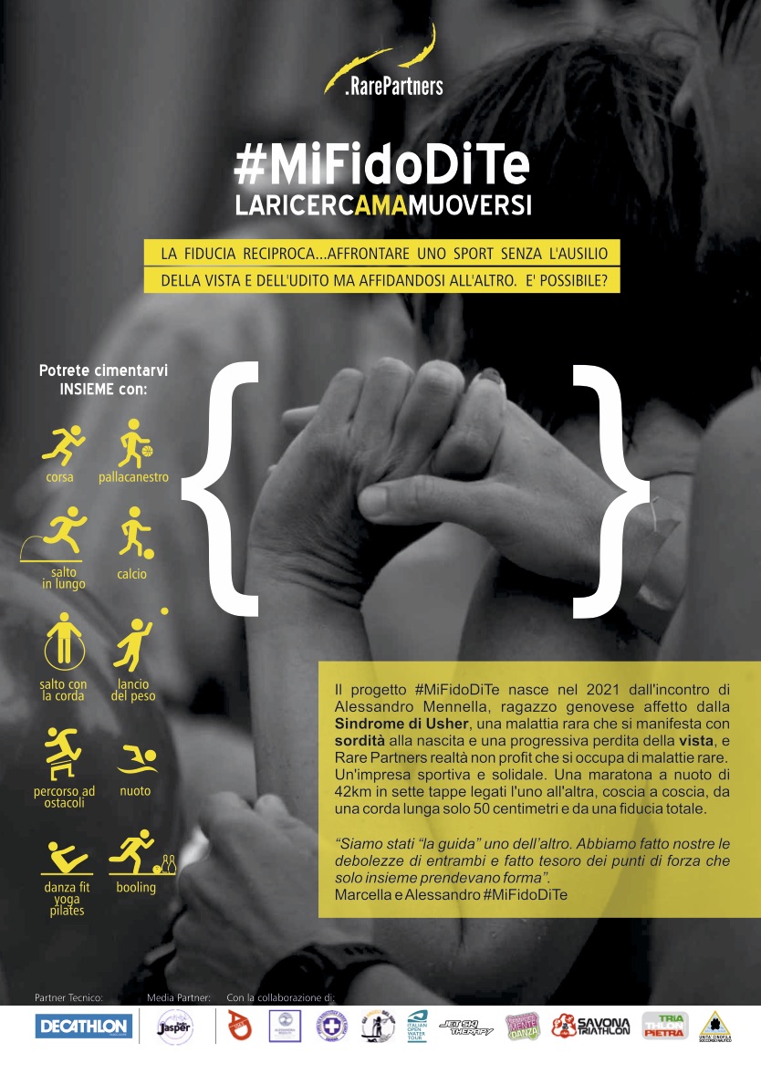 Patrocinato dalla città di Savona e con il supporto del Rotary Club Savona, #MiFidoDiTe è il progetto solidale che già nel 2021 aveva insegnato a diffidare dai limiti e non dalle proprie capacità, conquistando l’attenzione dei media con la straordinaria maratona a nuoto di 42Km percorsa in più tappe lungo l’Italia; un’impresa tanto sportiva quanto umana avente per protagonisti Alessandro Mennella, atleta ipovedente affetto dalla Sindrome di Usher, fianco a fianco con la stessa Rare Partners, realtà non profit impegnata nella ricerca, soprattutto negli studi sulla degenerazione retinica. Il tempo passa, la voglia di riprovarci resta, ed ecco che a distanza di un anno si torna in Liguria, in una rinnovata veste.